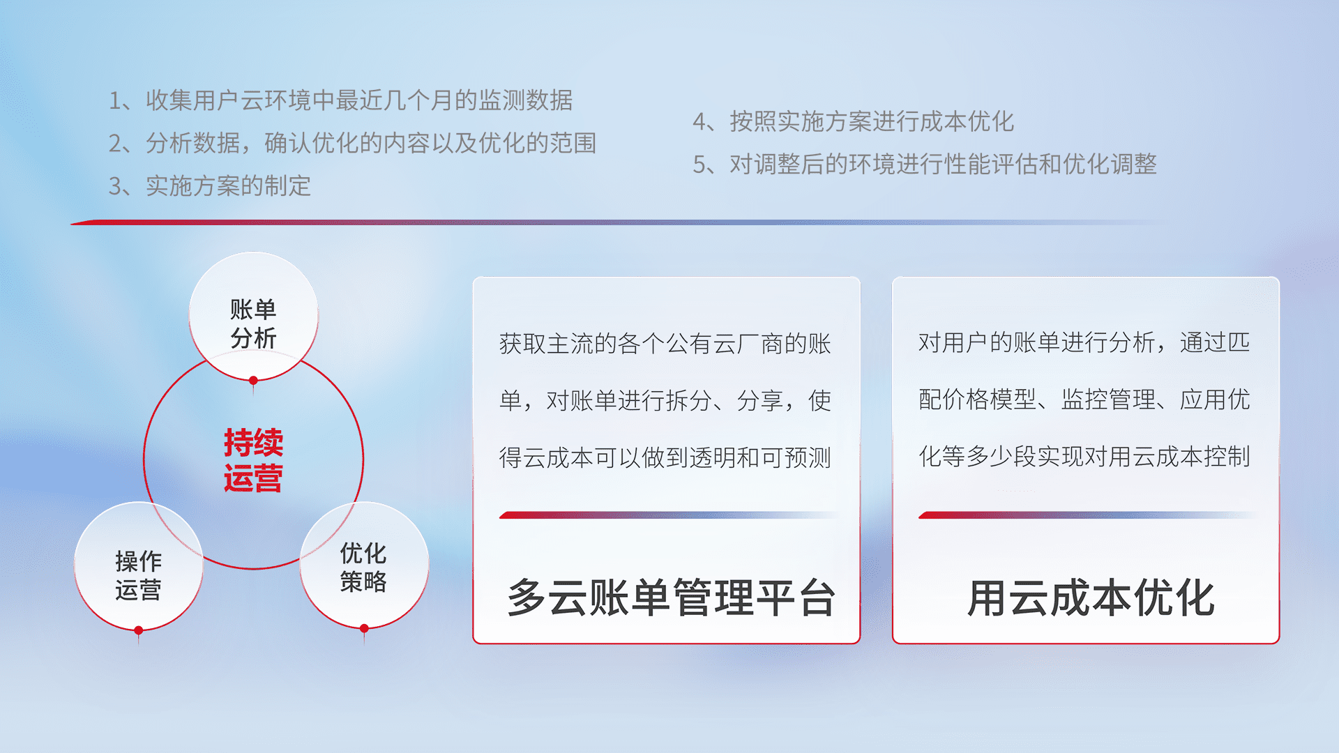 通过多云纳管,,以统一的资源数据模型把客户的云资源进行抽象和封装,,,进而实现对多云资源的统一操作,,,,保障云资源管理的可靠性、、稳定性与可用性。。量身定制化运维内容,,,,配置、、、、开发运维、、补丁管理、、、备份、、、监控、、认证和访问管理、、、、审计和日常巡检等,,保障在用云过程中的可靠度,,稳定度以及高可用率。。。。